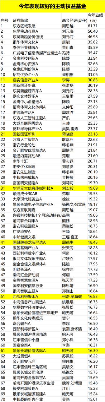 此外,金鹰信息产业、华商乐享互联、交银趋势优先、大成国企改革、华安安心消费服务、广发多因子、易方达环保主题等基金也表现较好。也涌现出一批如倪超、唐晓斌、杨金金、韩创、祁禾、刘畅畅、郑巍山、杜洋、陆彬、万民远、高兵、神爱前、崔宸龙等优秀基金经理。