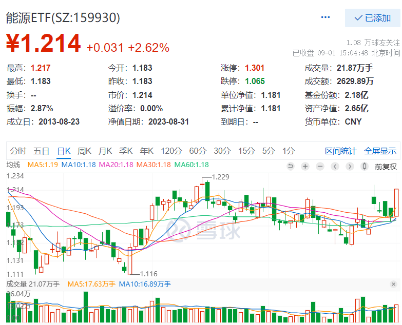 热门ETF方面,A股能源板块风向标——能源ETF(159930)今日放量上扬,收涨2.62%!上穿5日均线,一举收复此前四根阴线!成交额超2600万元,较前一交易日有所放量!同时尾盘转为溢价,或反映资金积极布局意愿强烈!