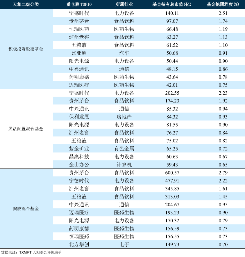 主动权益基金细分分类前十大重仓股票分析,数据来源:天相投顾