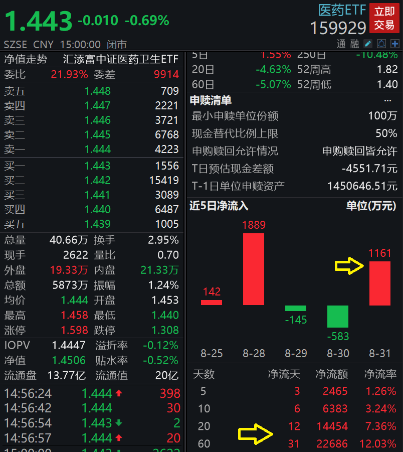 值得重点注意的是,医药ETF(159929)近期资金面火爆,昨日单日吸金1161万元,最近20日获得资金净流入超1.44亿元,最近60日有31日实现资金净流入,合计吸金近2.27亿元,反映资金逢低布局医药板块意愿强烈!