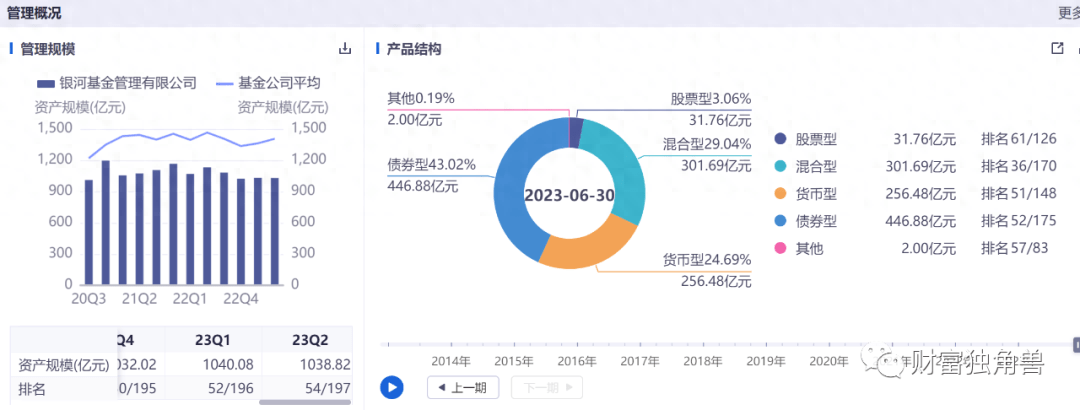 从产品结构来看,银河基金固收类占比高达六成,混合型基金占比29.04%,股票型基金占比只有3%。截至2023年2季度末,银河基金旗下债券型基金规模446.88亿元,占比43.02%;货币型基金规模256.48亿元,占比24.69%;混合型基金规模301.69亿元,占比29.04%;股票型基金规模31.76亿元,占比3.06%。从产品结构上看,银河基金固定收益类产品固收产品占比达65.16%,固收类业务仍占多数。