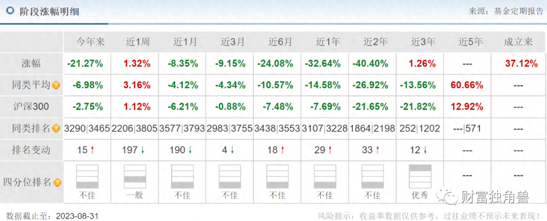 2021年1月25日-2021年2月24日又增加了一位基金经理,由杨琪、陈伯祯和祝建辉三人管理,任职回报-6.04%;此后又换回杨琪和陈伯祯管理,任职回报-12.26%;2021年10月27日至今,再度变成杨琪单独管理,但任职回报-31.07%。总体来看,各阶段也是各种调换基金经理,这种节奏其实并不利于基金经理运作基金产品。