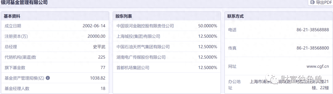 据百度百科显示,银河基金管理有限公司成立于2002年6月14日,是经中国证券监督管理委员会按照市场化机制批准成立的第一家基金管理公司,其股东构成中国银河金融控股有限公司占股50%,上海城投集团占股12.5%,中国石油天然气集团占股12.5%,湖南电广传媒有限公司占股12.5%,首都机场集团占股12.5%。银河基金成立以来,已发行并管理多只基金,涵盖股票、混合、债券、货币等系列品种。