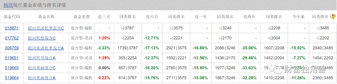 除了郑巍山业绩不理想外,杨琪业绩也不太理想。杨琪曾任职于上海原点资产管理有限公司研究部,2011年11月加入银河基金管理有限公司,从事投资、研究相关工作。2017年1月起担任银河君信灵活配置混合型证券投资基金的基金经理,2017年4月起担任银河美丽优萃混合型证券投资基金的基金经理,2017年7月起至2021年12月16日担任银河君耀灵活配置混合型证券投资基金的基金经理,2019年2月起担任银河转型增长主题灵活配置混合型证券投资基金的基金经理。