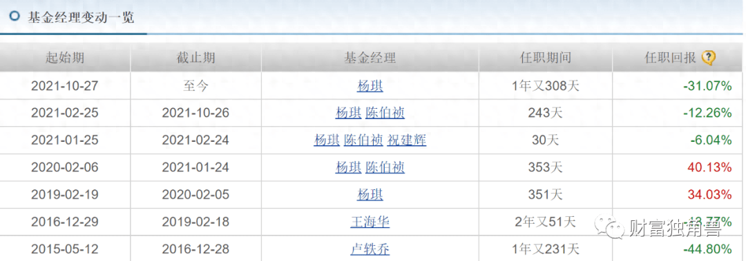从基金变动表看出,该基金成立来业绩不好也是有原因,成立之初由卢轶乔管理,任职回报-44.80%;2016年12月29日-2019年2月18日由王海华管理,任职回报-13.77%;2019年2月19日-2020年2月5日由杨琪管理,任职回报34.03%;2020年2月6日-2021年1月24日又换成杨琪和陈伯祯管理,任职回报40.13%;