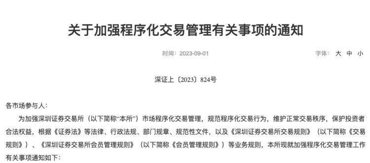 9月1日,深交所发布关于股票程序化交易报告工作有关事项的通知,自2023年10月9日起施行。