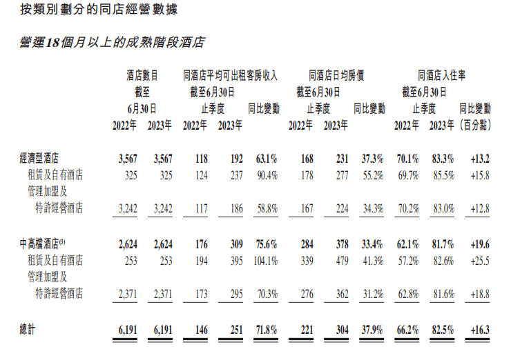 截至6月末,华住共持有4872家经济型酒店,3724家中档及中高档酒店,它们在总酒店数量中的占比达到98.24%;对应客房为81.82万间左右,占比约97%。若以这样的占比粗略估算,则意味着营运18个月以上的3567家成熟经济型酒店中,超3500家都是经济型及中高档酒店。