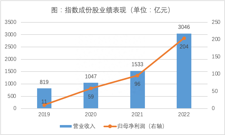 按照指数最新一期成份股计算,营收方面,指数成份股2021年、2022年营业收入分别增长46%和99%;从今年一季报来看,成份股营业收入延续了高速增长态势,同比增速达149%。