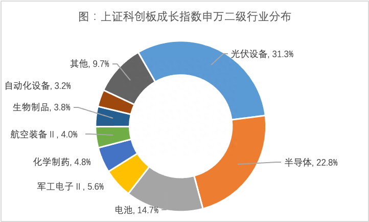 从行业分布上看,科创成长更集中布局于科技前沿发展方向,按照申万二级行业分类,Wind数据显示,截至2023年7月底,指数的前三大行业合计占比近七成。其中,光伏设备占比31%,半导体占比23%,电池占比15%,行业分布较为集中。行业发展方向契合中国经济发展趋势。