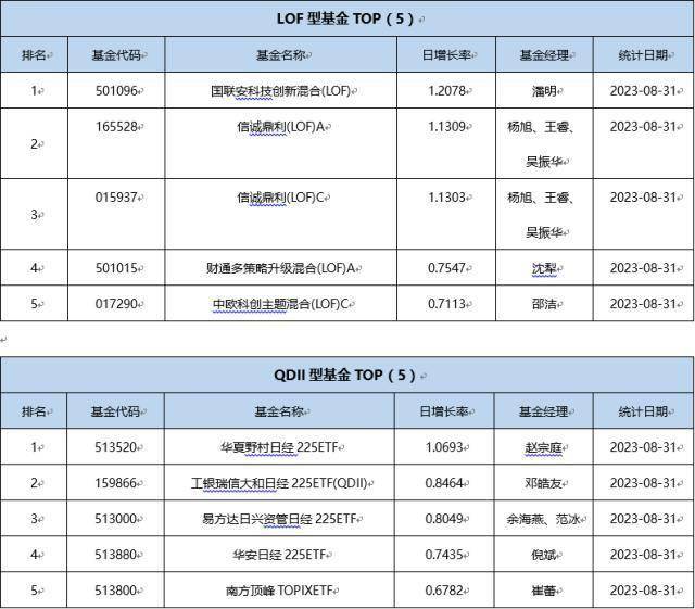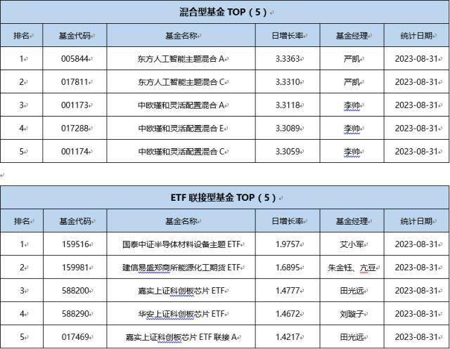 单基金方面,剔除掉 创新封基类型 基金的影响,8月31日业绩表现最好的基金为招商中证半导体产业ETF,日增长率为6.2431 %,其次为东方人工智能主题混合A,日增长率为3.3363 %、东方人工智能主题混合C,日增长率为3.3310 %。
