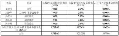 2、授予数量:授予限制性股票1,765.00万股,占公司当前股本总额的1.075%