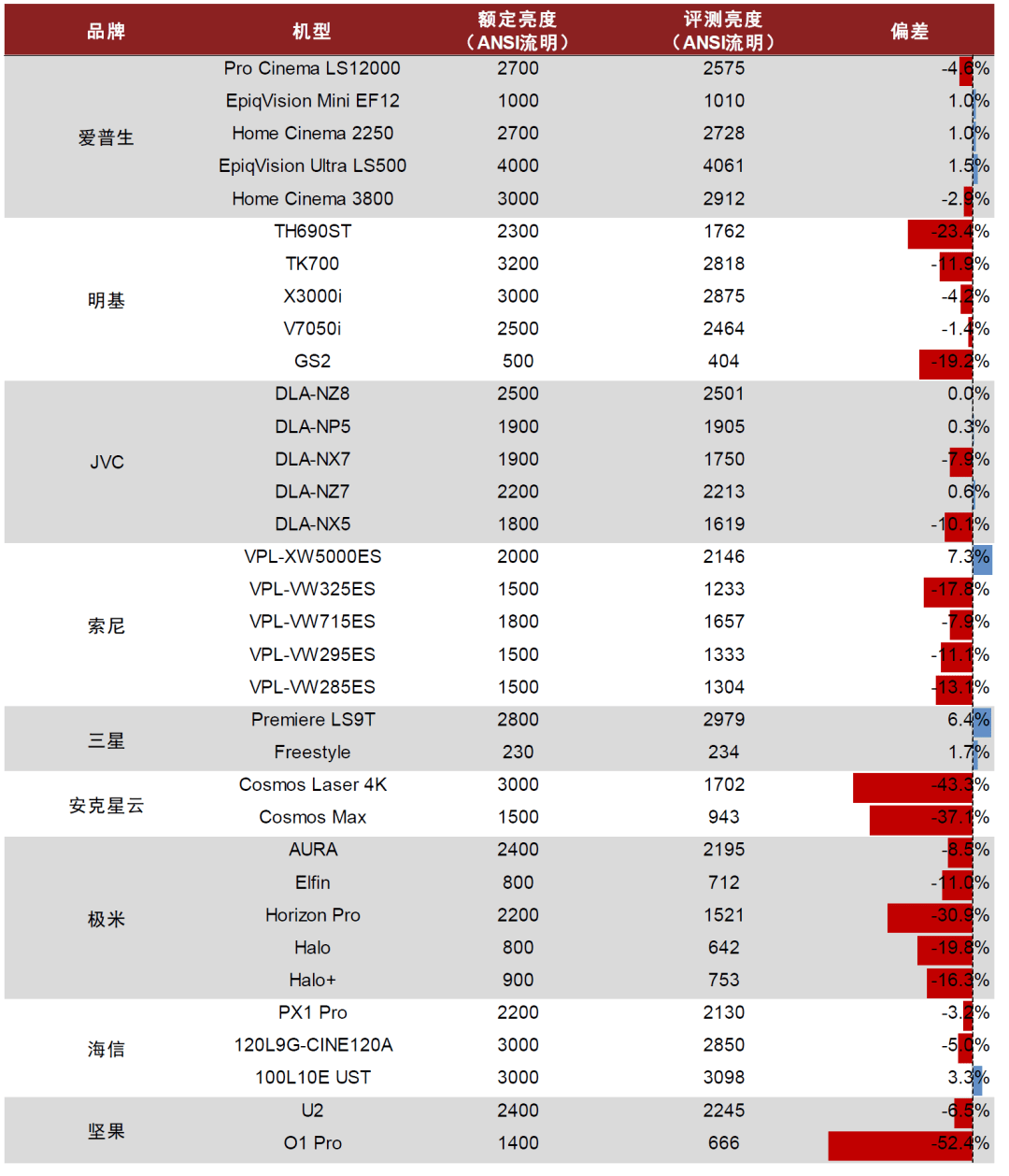据Projector Central评测,海外投影品牌基本不存在亮度虚高问题,爱普生、JVC的测试亮度偏差在10%以内,索尼在20%以内。而国内出海品牌,安克星云、极米和坚果的投影仪则出现了不同程度的亮度虚高问题。