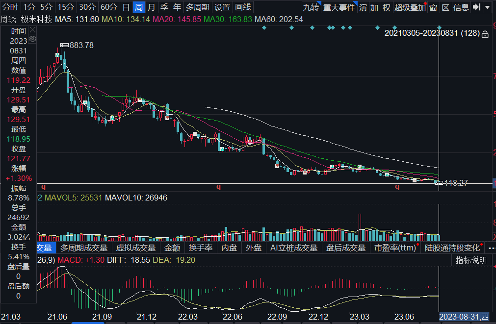 遥想2021年,投影仪第一股上市后的3个月,极米的股价就冲破600元,市值翻了5倍,冲破400亿元。而600元,是攀上过的最高峰,自21年7月以后,极米就开始稳走下坡路。截止今日,其股价累计跌幅接近85%。