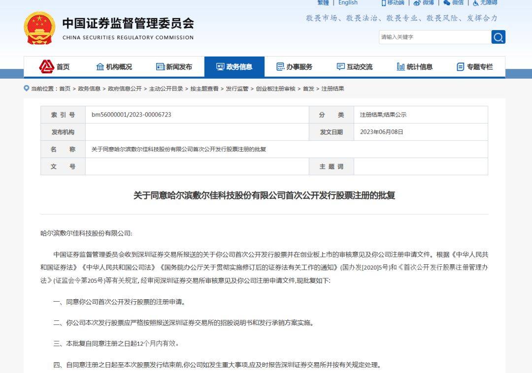 6月8日,中国证券监督管理委员会网站发布公告,同意哈尔滨敷尔佳科技股份有限公司(以下简称“敷尔佳”)首次公开发行股票注册。这也就意味着,敷尔佳已经收到了上市“通知书”,离正式上市仅有一步之遥。