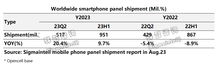 群智咨询(Sigmaintell)全球智能手机面板出货追踪数据显示,2023年上半年全球智能手机智能面板出货约9.5亿片(Open Cell口径),同比增长约9.7%。Omdia预计,智能手机显示面板出货量将在2023年第三季度达到3.856亿片,同比上升22%。