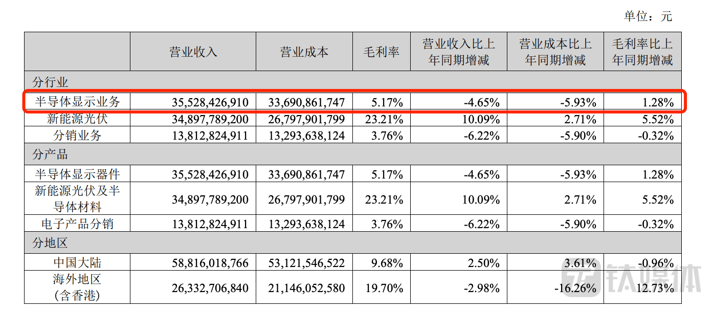 报告期内,实现营业收入851.5亿元,同比增长0.7%;实现归属于上市公司股东净利润 3.4 亿元,同比下降48.68%。对于来说,收入的增长更多的是来自于新能源光伏业务的推动,而面板显示业务则依旧是负增长。上半年,其半导体显示业务收入为355.3亿元,同比减少4.7%。