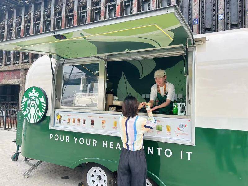 位于首钢园15号展馆外的“星巴克移动咖啡车”,极富星巴克品牌特色的Mini Bus咖啡车造型小巧可爱、车身覆以星巴克经典的白色与绿色。顾客可以通过敞开的大尺寸车窗选择丰富的饮品,除了拿铁、美式等经典饮品,还有慕斯浓缩系列,拥有多巴胺配色的生咖系列等。