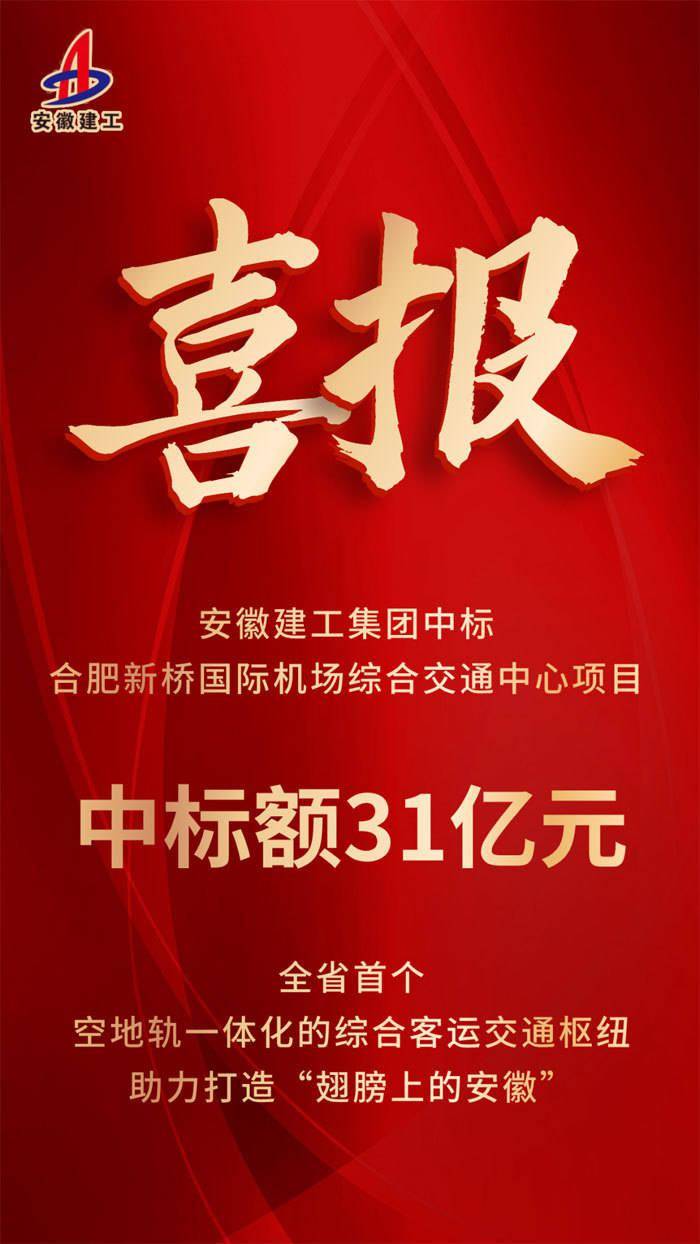 近日,安徽建工集团所属安徽路桥同中建三局组成联合体成功中标合肥新桥国际机场综合交通中心(含轨道引入)及配套工程施工总承包项目,中标金额约31亿元。
