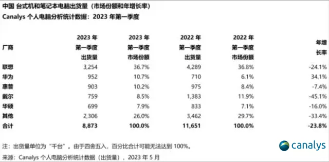 最近,市调机构Canalys发布2023年第二季度中国大陆个人电脑出货量。