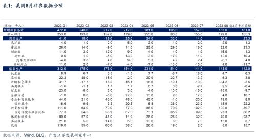 美国2023年8月新增非农18.7万人,高于市场预期的17万人以及前值15.7万人,依旧呈现较强韧性。8月新增非农主要贡献项依旧在服务业,包括医疗保健和社会救助以及休闲和酒店业等; 但值得注意的是,制造业新增就业由负转正,这与同日公布的S&P Global制造业PMI超预期回升至47.9、ISM制造业PMI回升至47.6可以相互印证,反映加息对利率敏感型行业的作用已有所钝化。负面线索主要是运输和仓储以及临时工就业新增为负,美国卡车货运公司Yellow倒闭以及好莱坞罢工可能是主要背景,属暂时性因素。