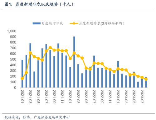 2023年8月新增非农18.7万人,高于市场预期的17万人,且较前3个月月均新增的18.1万人小幅回升。2023年6月数据由增18.5万人下修至10.5万人,2023年7月数据由增18.7万人下修至15.7万人,6月和7月总共下修11万人,导致3月月均新增从18.1万人回落至15万人。