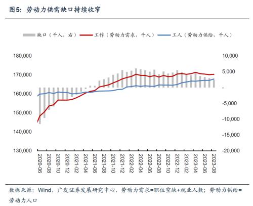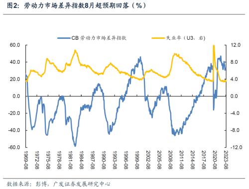 第二,同期公布的8月住户调查数据(household survey)却有所降温。失业率(U3)从3.5%上升至3.8%,高于市场预期的3.5%,主要源自总劳动力人口上升73.6万人(而就业人口仅上行22.2万人),其中移民以及青年人口进入劳动力市场为主因;U6失业率上行0.4个百分点至7.1%,因经济原因而选择兼职的人数显著上升22.1万人。从失业原因看,被动失业人数(job losers)上升29.4万,主动失业人数(job leavers,自愿离职)下降5.1万人,主动和被动失业人数比率从7月的33%回落至27%,为2022年1月以来最低。此外,先导指标劳动力市场差异指数在8月显著回落6.2个百分点至26.2(前值32.4),8月公布的职位空缺和离职率数据亦指向就业市场松动。整体来看,职位空缺下降叠加劳动力供给抬升引导就业供需缺口收窄至247万人,较疫情高点605万人显著回落,反应就业市场逐步降温。