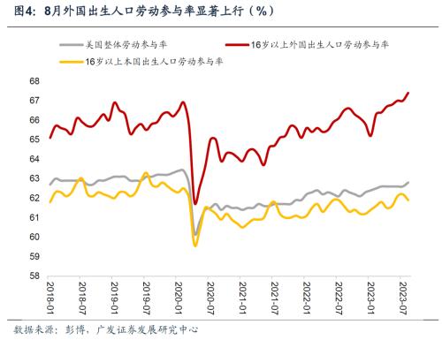 8月失业率回升至3.8%,前值3.5%,市场预期3.5%。其中,登记失业人数上行51.4万人、劳动力总人口上行73.6万人为主要原因,青年(16+24岁)以及移民劳动参与率显著上行为主因,两者劳动参与率分别升至56.1%(前值55.3%)和67.4%(前值67%)。需要注意的是,美国移民人口以及移民工作人数增速迅猛,2023年以来,月度新增外国出生人口以及外国出生人口就业人数分别为13.5万人(2018-2019月均水平为3.7万人),和15.8万人(2018-2019月均水平为4.7万人)。