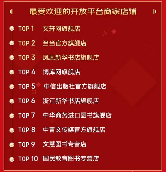 众多开放平台商家店铺也在此次活动期间大放异彩、收获佳绩。其中,文轩网旗舰店、当当官方旗舰店、凤凰新华书店旗舰店等店铺,携高品质图书获得更多读者青睐。