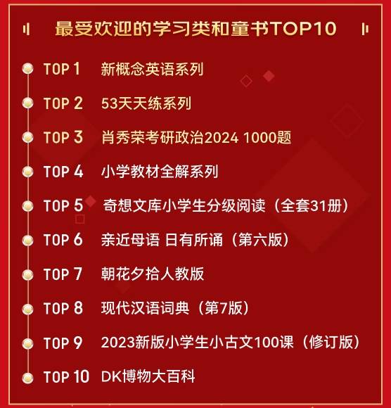 在最受欢迎的学习类和童书TOP 10中,英语、小学全科、考研政治等书籍备受欢迎。《新概念英语系列》《53天天练系列》《肖秀荣考研政治2024 1000题》位居前三。