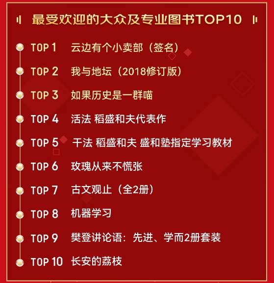 京东图书超级品类日期间,“治愈系”图书热销。在最受欢迎的大众及专业图书TOP 10榜上,睡前心灵鸡汤《云边有个小卖部》、史铁生散文集《我与地坛》、历史趣味漫画《如果历史是一群喵》荣登前三名。