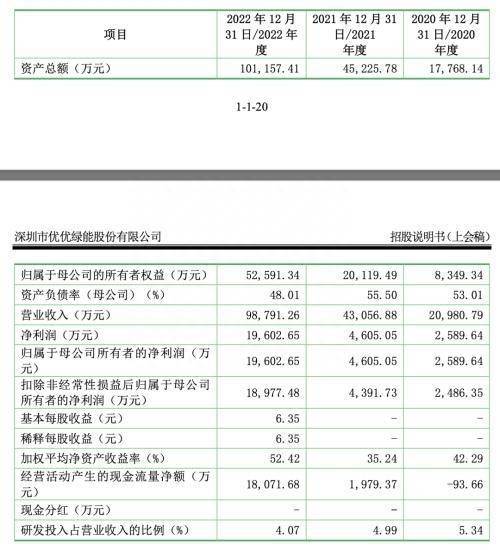 招股书显示,2020-2022年,优优绿能营业收入分别为2.10亿、4.31亿、9.88亿元,复合增长率达116.99%;净利润及归母净利润分别为2589.64万、4605.05万、1.96亿元;扣非归母净利润分别为2486.35万、4391.73万、1.90亿元。