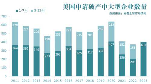 根据标普全球市场情报的数据,今年前7个月,美国共收到402起中大型企业破产申请,数量超过去年全年。