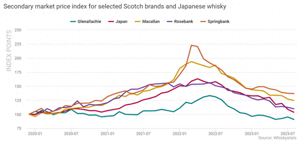 另一方面,也有一些品牌的价格波动极大。这部分威士忌的价格多是一个劲地涨至2022年初,随后出现大幅下滑。比如,云顶、麦卡伦,它们的指数就比去年峰值低了35%以上。