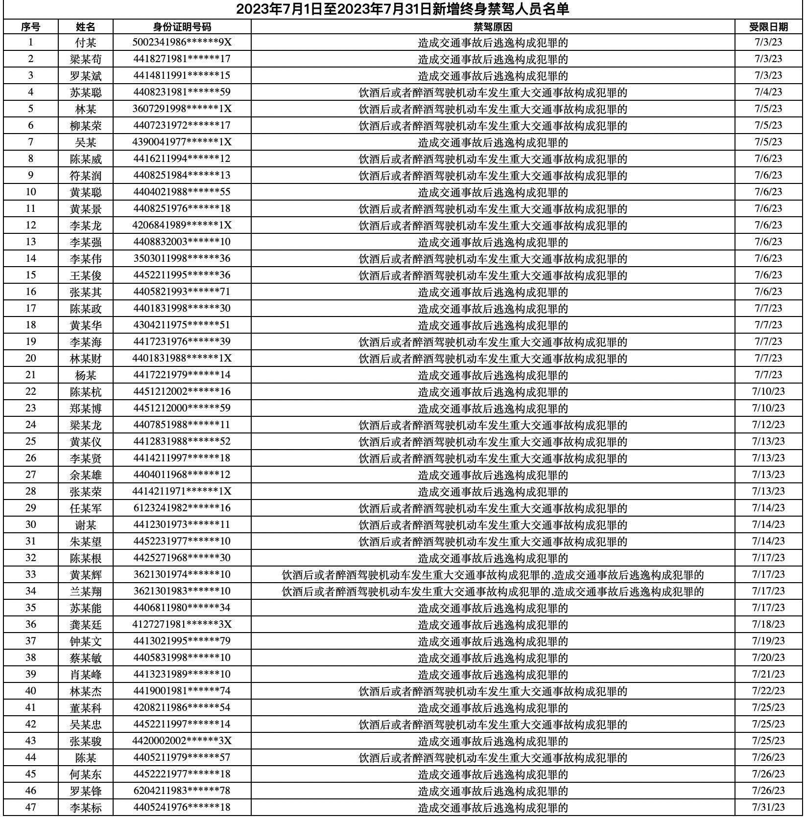 9月2日,广东省公安厅交通管理局集中曝光一批重点企业、车辆以及终身禁驾人员。南都记者获悉,今年7月,广东新增47名终身禁驾人员,其中持AB证驾驶人7人。