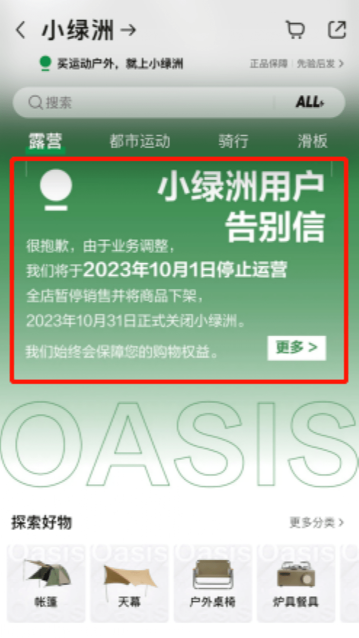 对于“小绿洲”关停原因,在告别信中,小红书方面表示,“小绿洲”在业务的探索和发展过程,没能实现最大化满足大家户外需求的预期目标。
