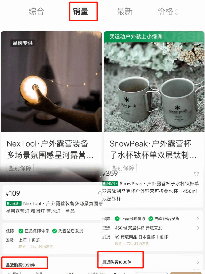 从产品销量来看,截至目前,“露营”品类产品中,以销量排名搜索,仅有五款商品近期销量破千。其中,销量最高的为一款标价109元的露营灯,最近购买量为5031件;排在第二位的为一款可折叠水杯,售价359元,最近购买量为1636件。