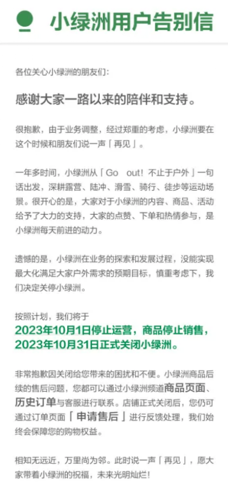近日,小红书旗下运营一年多的电商平台“小绿洲”忽然发布了用户告别信,宣布将于今年10月1日停止运营,并于10月31日正式关闭。