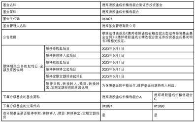 (1)根据香港交易所2023年9月1日发布的公告,受台风天气影响,香港证券及衍生产品市场于2023年9月1日全天暂停交易。为保障基金的平稳运作,维护基金份额持有人利益,德邦基金管理有限公司(以下简称“本公司”)决定于2023年9月1日暂停德邦港股通成长精选混合型证券投资基金(以下简称“本基金”)的申购、赎回、转换和定期定额投资业务,暂停期间投资人提出的上述业务申请,本基金管理人将确认失败。