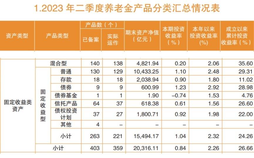 不过养老金产品的主要资产还是集中在固定收益资产方面,二季度末,359个实际运作的养老金产品,期末资产净值超过2万亿元,二季度投资收益率达到了0.84%,且今年以来的投资收益率达到了2.26%。