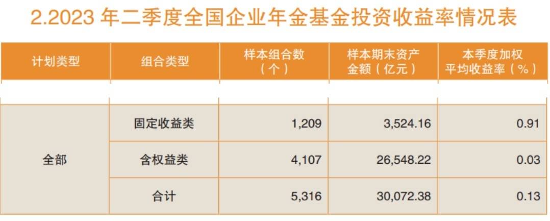 近日,人社部社会保险基金监管局披露了2023年二季度全国企业年金基金业务以及养老金产品的相关运作数据,记者注意到,全国企业年金投资资产净值突破了3万亿元,二季度的投资收益为39.49亿元,加权平均收益率为0.13%。