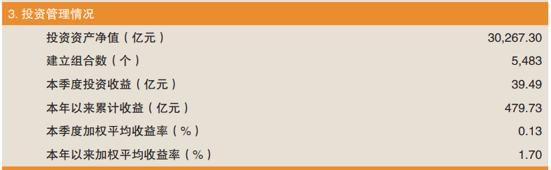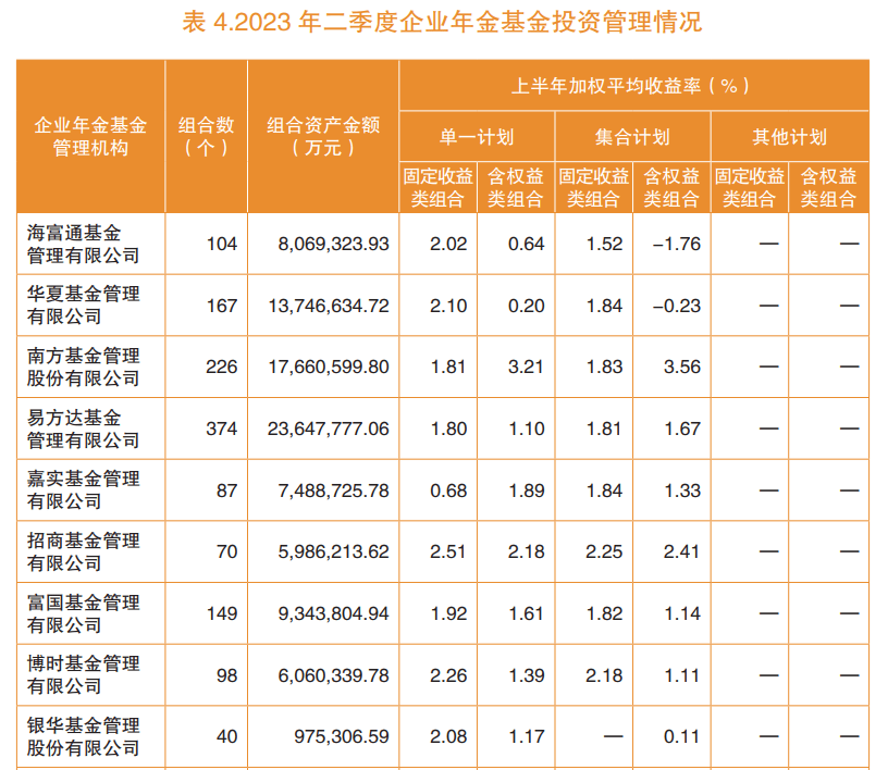 再从收益率情况来看,全国企业年金二季度的投资收益为39.49亿元,加权平均收益率为0.13%,如果再加上一季度的收益,今年以来的累计收益为479.73亿元,加权平均收益率为1.7%。