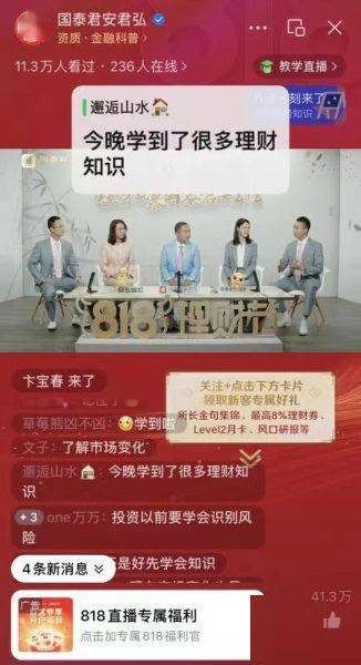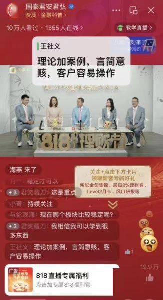 投顾全程陪伴投资旅程,提升客户ETF投资获得感。国泰君安早在2020年推出“投顾金才”计划,通过分类分级的方式打造了一支能为客户提供专业产品销售、资产配置、投资顾问服务的专业队伍。国泰君安第七届818理财节全新推出“投顾在线”全天候陪伴式解盘直播,汇聚国泰君安首席投顾、专家投顾等专业投顾人才,交易时间全程在线,围绕ETF投资呈现专业市场解读,以专业服务强化客户对财富管理平台和服务的信任。818理财节期间投顾在线解盘直播观看人次超170万,同比提升超76.5%。