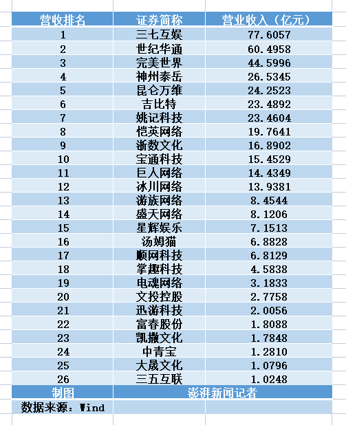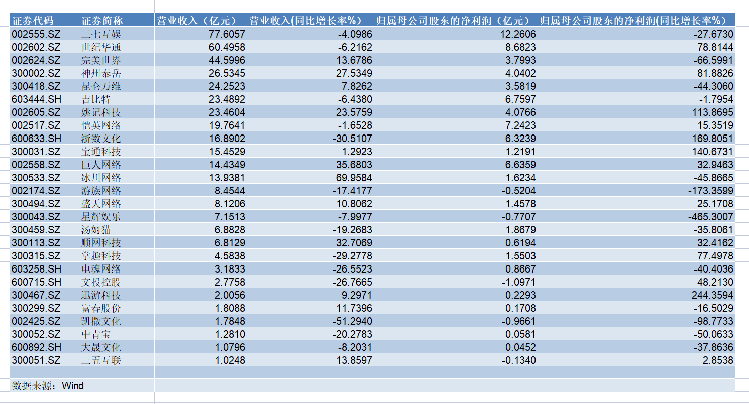 过半A股游戏公司营收下滑,三七互娱业绩第一