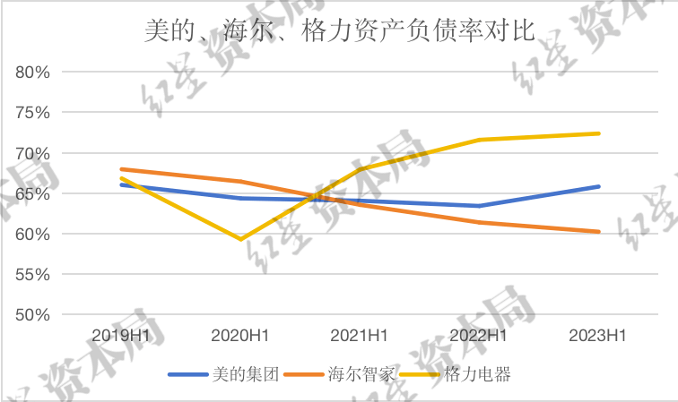 从资产负债率角度看,今年上半年,美的、海尔、格力的资产负债率分别为65.80%、60.21%、72.37%,格力的资产负债率最高。