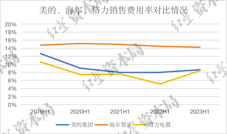 具体来看,导致海尔净利率过低的主要原因,在于企业销售费用率非常高。财报显示,今年上半年,美的、海尔、格力的销售费用率分别为8.7%、14.3%、8.4%,海尔的销售费用率远高于同行。