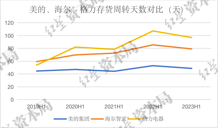 从存货周转天数看,今年上半年,美的、海尔、格力的存货周转天数分别为48.73天、79.20天、97.05天。