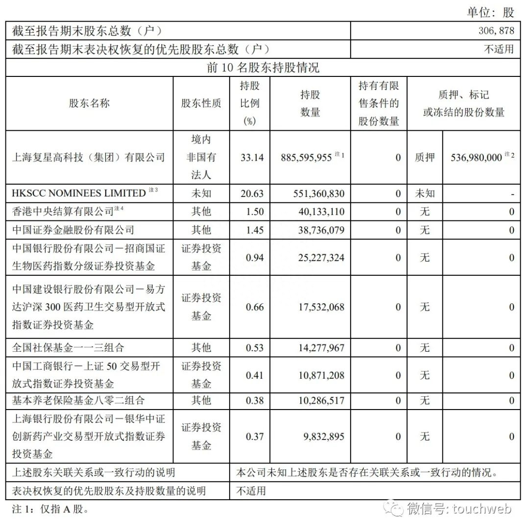 截至2022年12月31日,上海复星高科技(集团)有限公司持股为33.14%,HKSCC NOMINEES LIMITED持股为20.63%,上海高毅资产管理合伙企业(有限合伙)-高毅邻山 1 号远望基金持股为1.78%;