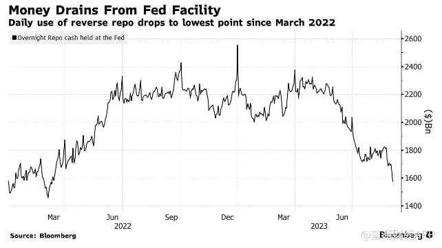 周五,有94家对手方在这个机制中存放了1.574万亿美元,比周四下降了4.7%,这是自2022年3月以来的最低水平。隔夜逆回购协议的使用量在6月30日曾超过2万亿美元,本周已下降了13%。