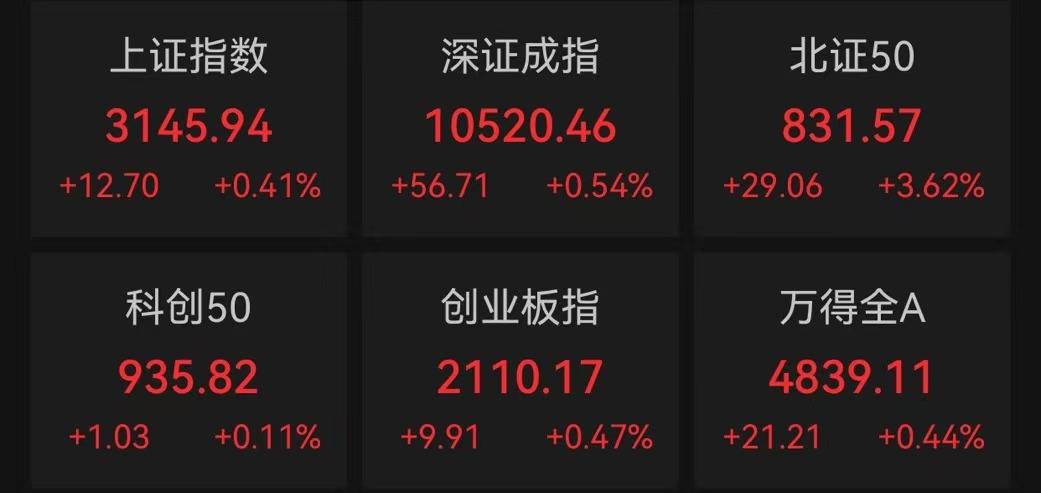 中新经纬9月4日电 4日早间,A股三大指数小幅高开,上证指数涨0.41%,报3145.94点;深证成指涨0.54%,报10520.46点;创业板指涨0.47%,报2110.17点。