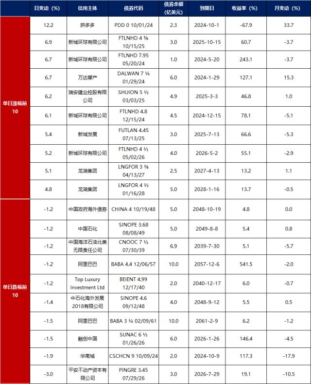 多数地产债成交价格相对稳定,10只债券成交价格偏离幅度超10%,“19远洋01”跌超19%,“H金优01”跌超36%,“21金地MTN007”跌超42%,“H1融创03”跌超52%,“H1金科03”“H0金科03”“H9金科03”跌超99%;“21远洋控股PPN001”涨超10%,“20中骏02”涨超14%,“19远洋02”涨超18%。